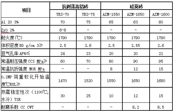 抗剝落高鋁磚:我公司生產的抗剝落高鋁磚是以特級高鋁礬土熟料為主原料,添加三石或ZrO 2,按一定配比經高壓成型制得的燒成制品。產品具有抗剝落能力強,同時還具有搞鉀、鈉、硫、氟及堿性鹽的侵蝕,低導熱率等性能,是水泥窯過渡帶及分解帶的理想材料。